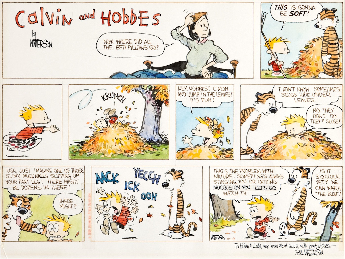 Die von Bill Watterson 1986 geschaffene Originalzeichnung einer Sonntagsseite des Comic Strips „Calvin and Hobbes“ ist bei einer Online-Auktion in den USA für 203.150,00 Dollar versteigert worden.